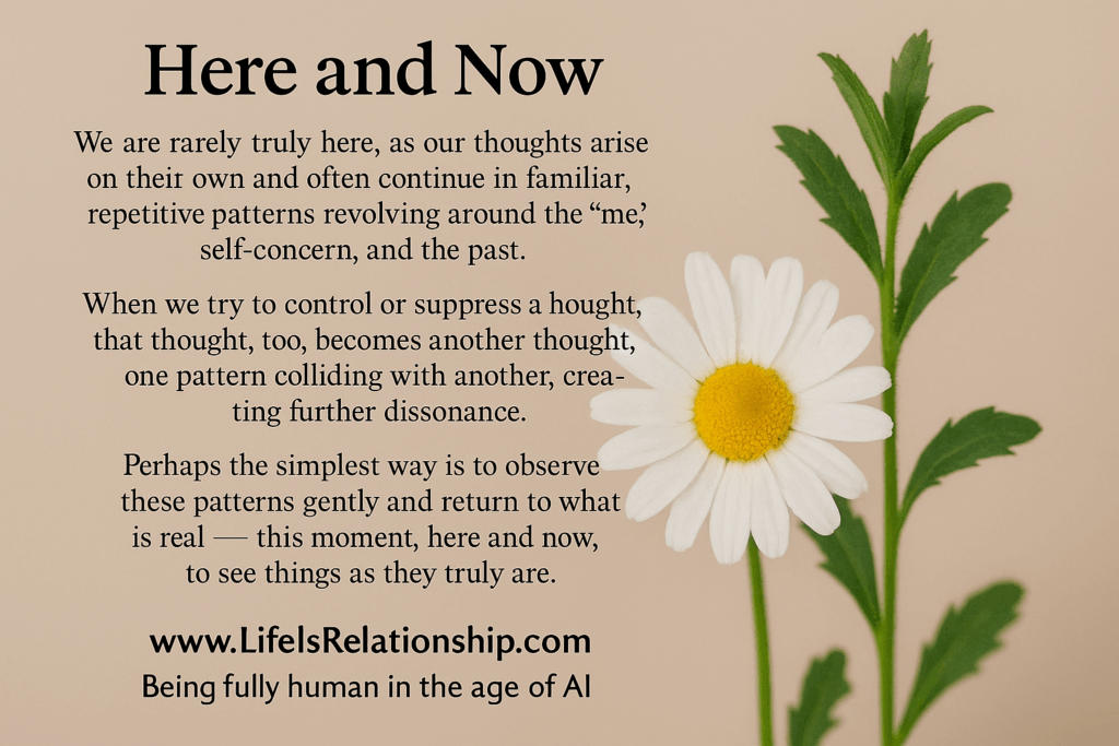 Life unfolds in this moment, yet our minds often drift into familiar patterns of self-concern and the past. By observing these patterns gently, we reconnect with what is real — the here and now.