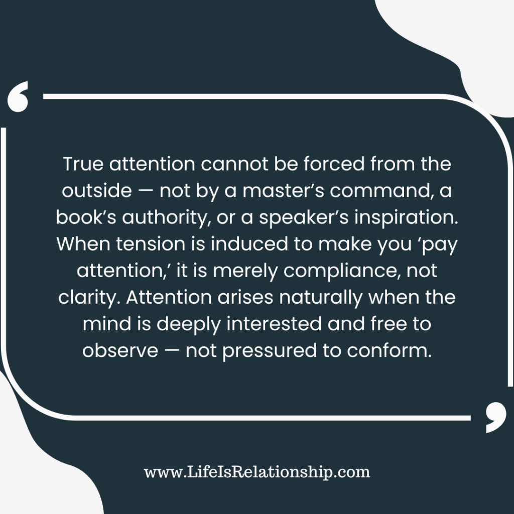 Why Attention Matters – In Life, in Relationships, and in Ourselves https://lifeisrelationship.com/why-attention-matters-in-life-in-relationships-and-in-ourselves/?utm_source=rss&utm_medium=rss&utm_campaign=why-attention-matters-in-life-in-relationships-and-in-ourselves Wed, 23 Jul 2025 11:52:43 +0000 https://lifeisrelationship.com/?p=36703 A simple, reflective conversation Have you ever tried crossing a busy road while thinking about something else? Your body may be walking, but your mind is somewhere else — and that moment of inattention could cost you. You could get hit, or miss a sign, or put yourself in danger. It’s the same with driving…