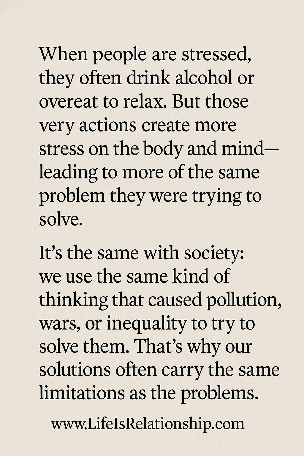 The Paradox of Our Thinking: Why Problems Persist  https://lifeisrelationship.com/the-paradox-of-our-thinking-why-problems-persist/?utm_source=rss&utm_medium=rss&utm_campaign=the-paradox-of-our-thinking-why-problems-persist Mon, 22 Sep 2025 16:53:35 +0000 https://lifeisrelationship.com/?p=36722 We live in a world overflowing with complex challenges—climate change, pollution, wars, inequality, and even the threat of nuclear weapons. These problems often feel overwhelming, and yet, almost every day, new “solutions” are put forward. Governments create policies, companies launch initiatives, and individuals make lifestyle changes. And still, the problems persist.  Why?  Here lies a…